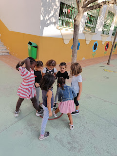 También nos ha contado un cuento chulísimo de unos pájaros que colaboraron para lograr juntos su propósito. Así que esta idea tan chula la hemos aplicado después en el juego que hemos hecho en el patio con aros de colores, colaborando para conseguir que nadie se quedara fuera.